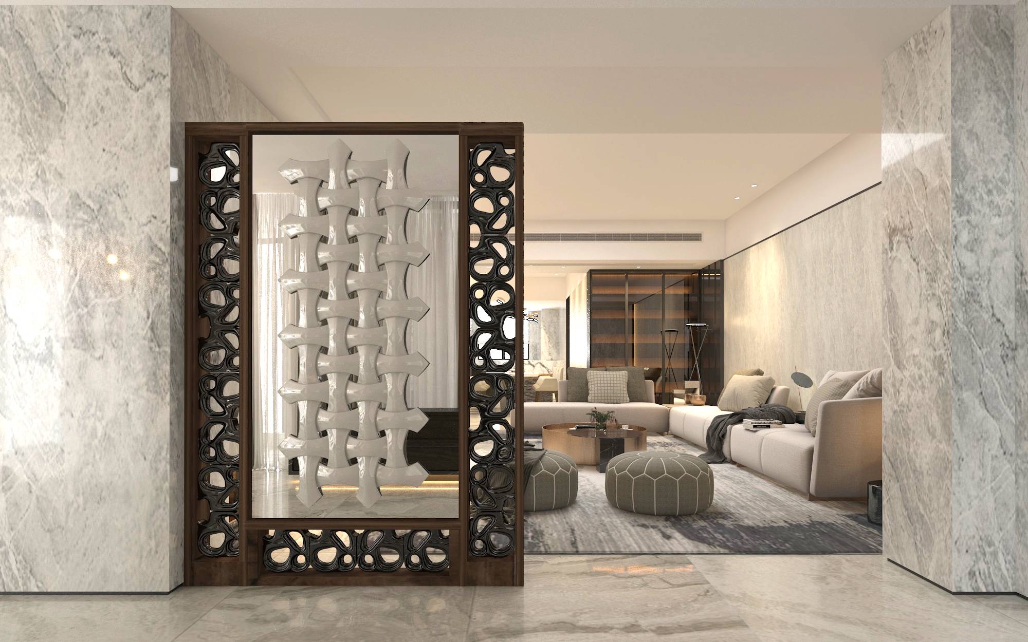 بارتشن داخلي مبتكر يجمع بين المنتجات البديلة للخشب والبلوكات المصنوعة من السيراميك، بالإضافة إلى القطع الخزفية بأبعاد 25×25 سم لكل قطعة.