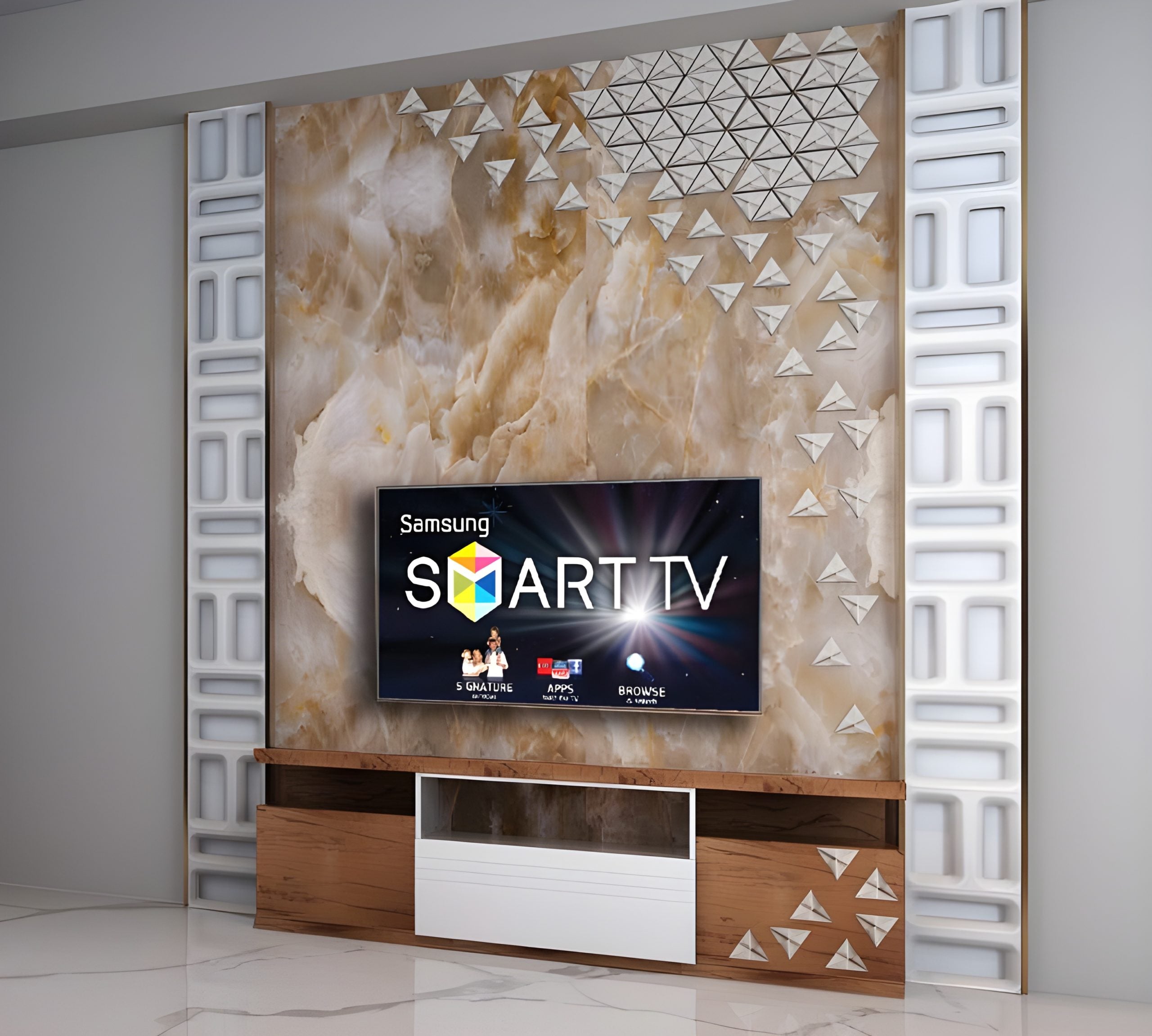 واجهة الهاتف التلفزيوني واجهة تلفزيون مصممة خصيصًا لشاشة بحجم 70 بوصة، بأبعاد عرض 300 سم عرضًا، 280...