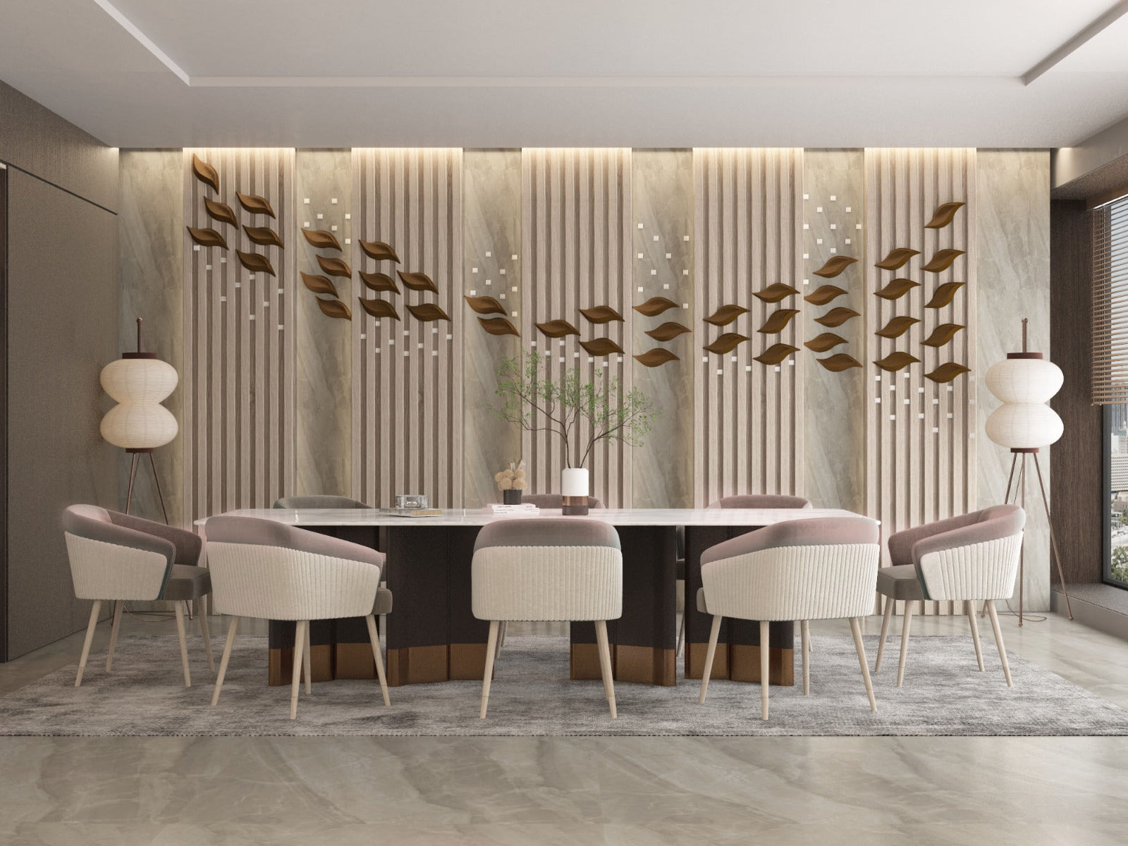 كسوة حائطية تغطي الواجهة بالكامل، تتميز بتصميم فريد يجمع بين البلاط الإبداعي ثلاثي الأبعاد والألواح الخشبية الصناعية،...