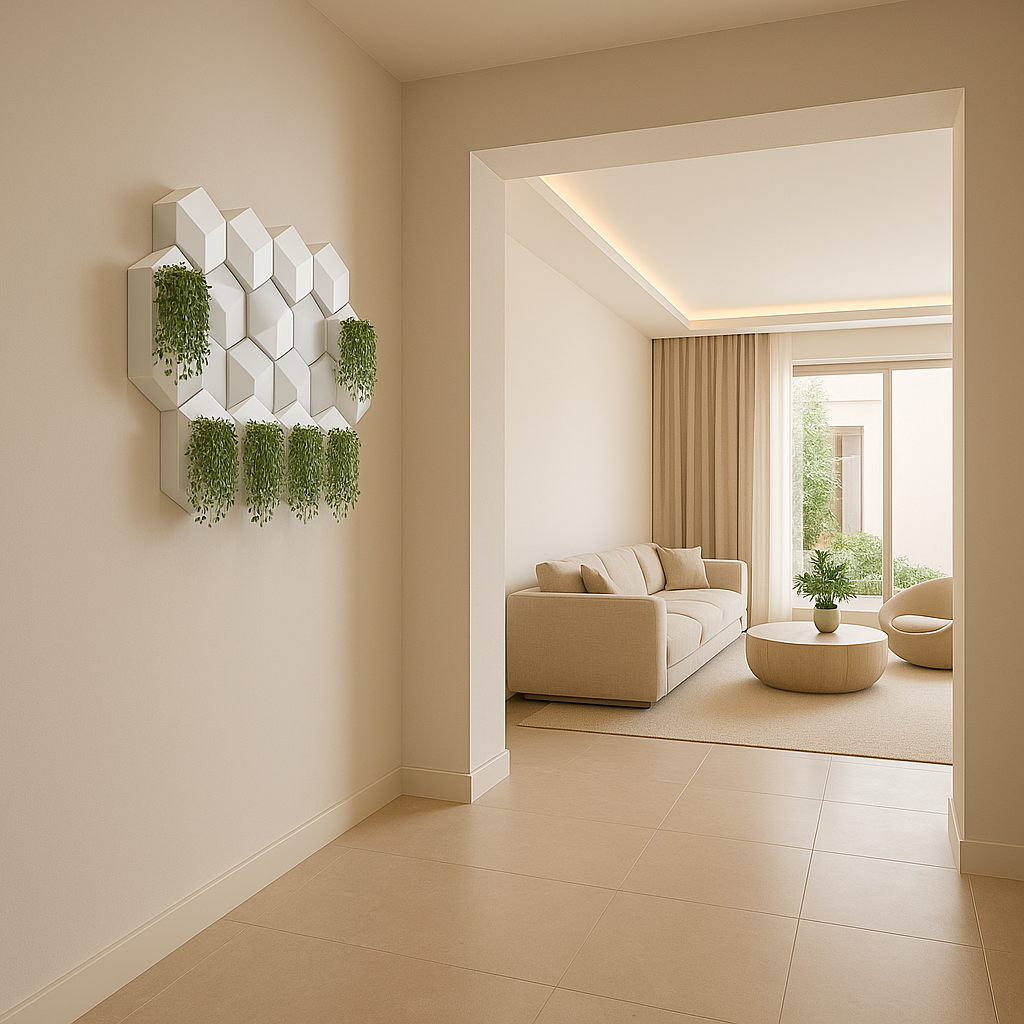 لوحة فنية مصنوعة من بلوكات خزفية مصممة هندسيًا، تشمل قطعًا مناسبة لزراعة النباتات المنزلية سواء كانت طبيعية...