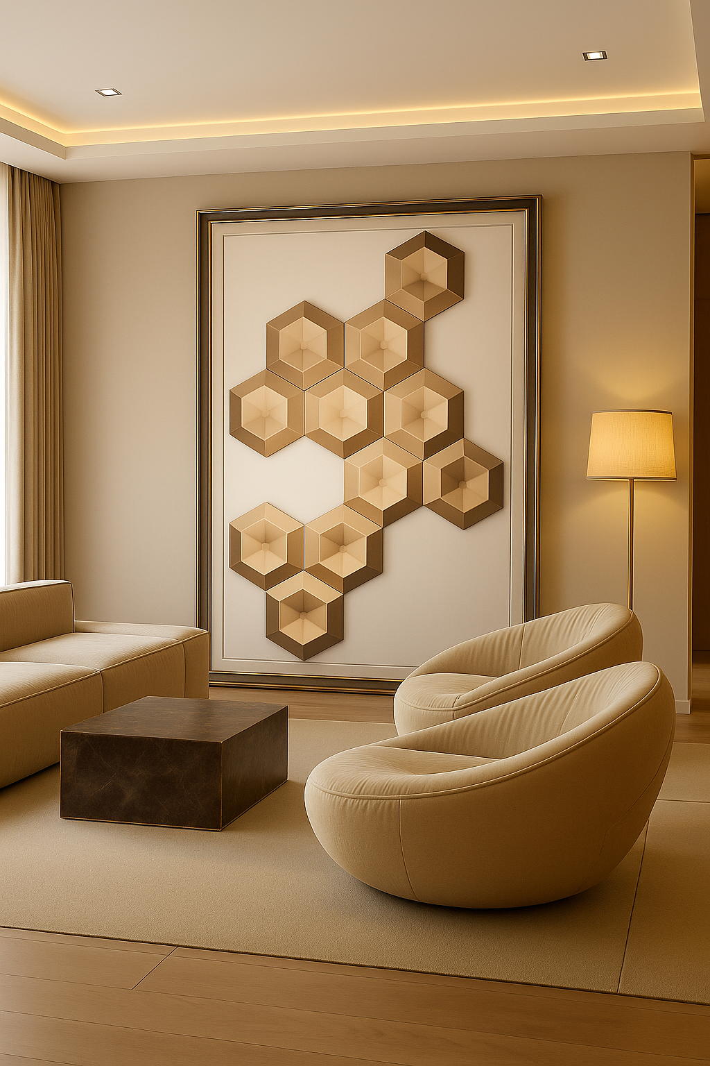 لوحة فنية ثلاثية الأبعاد مصممة من قطع خزفية سداسية الشكل بقياس 20 سم، بأبعاد 80 سم عرضًا و110 سم ارتفاعًا، تتميز بلون ذهبي يضفي أناقة مميزة على الديكور الداخلي.